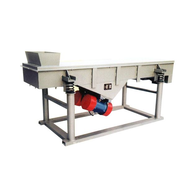 當縱向安裝在篩體上的兩臺振動電機兩端的偏心塊便產生額定激振力,其產生在橫向的激振力相互抵銷,其縱向的激振力通過傳振體傳遞到整個篩面上,從而使篩面上的物料受其激振力而在篩網面上向出料口方向跳躍運動。小于篩孔的物料通過篩孔落到下層,大于篩孔的物料經連續跳躍后,經出料口流出,由于篩分過程合理,可將物料經振動篩分級后,取得幾種不同顆粒的物料,完成物料的分級。